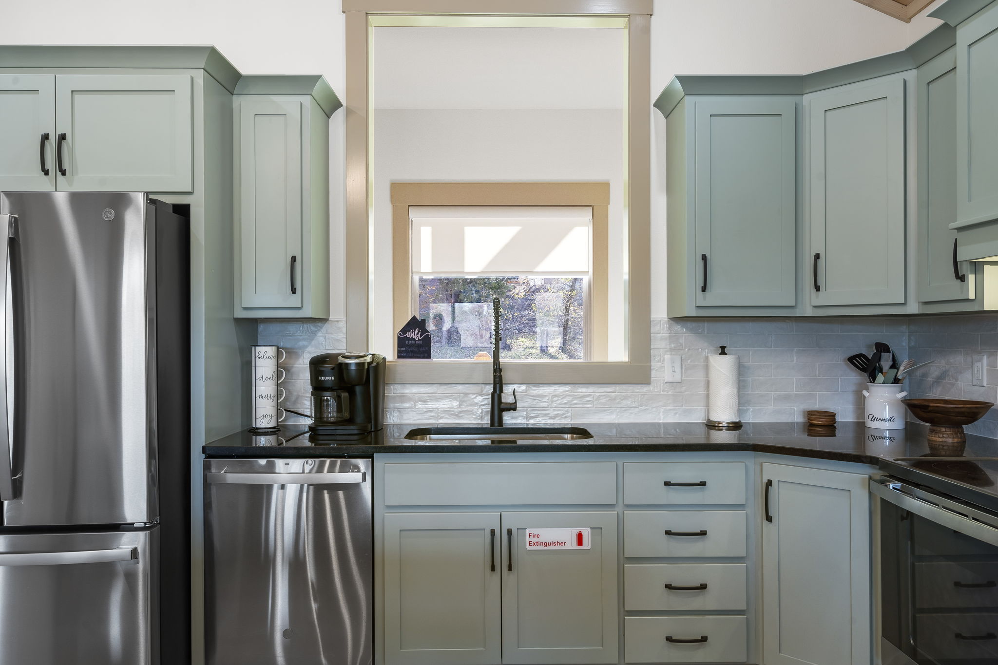 As you step through the front door, you’ll be greeted by a fully-equipped kitchen ready to inspire your culinary creativity. Whether you’re in the mood to prepare a gourmet four-course meal or simply want to pop some popcorn for a cozy movie night, this kitchen has you covered. The living room features comfortable furniture that invites you to snuggle up by the floor-to-ceiling stone fireplace – an ideal spot for enjoying a good book or a family movie night.